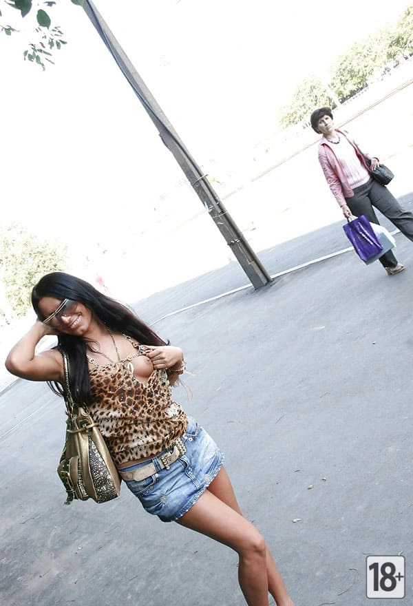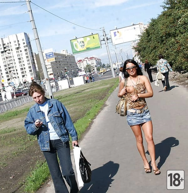 Красивая телка выставляет напоказ свои прелести перед прохожими.